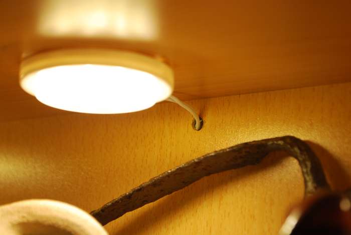 il existe aussi ces modeles de lampes a pile que l'on eclaire que si besoin et fixée avec un scotch double face ,donc sans fil et sans trous . chez bricolage .