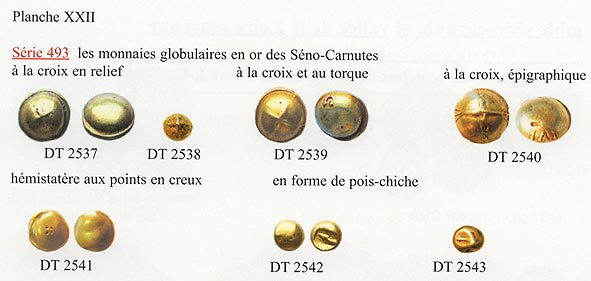 Il indique (page 126) : 'Les monnaies sub-sphériques marquées d'une croix, bien connues sous le nom de 'globules à la croix', ont fait l'objet de nombreuses trouvailles au nord et surtout au sud de la Seine moyenne, sans qu'il soit possible de les attribuer à un peuple déterminé. En effet, si le nombre des provenances d'exemplaires isolés plaide en faveur des Carnutes, il semble que la carte des dépôts groupés privilégie les Sénones. C'est à proximité de Sens (Yonne) que fut découvert en 1992 un trésor de 242 statères de ce type (Barrandon et alii, BSFN 1993, p.637-644) datant de la fin de l'indépendance. Parmi les monnaies globulaires, celles 'à la croix' constituent la dominante écrasante des quelques types inventoriés'. (sic)