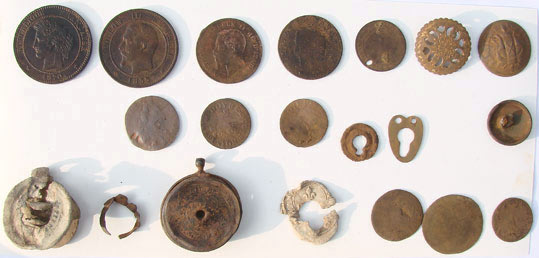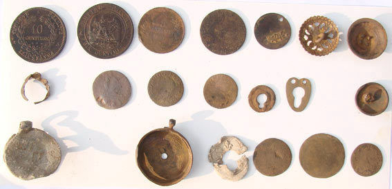 Sortie sympa ce dimanche. Une promenade qui valait la peine. Avec autorisation du propriétaire, petit pré à chevaux près d'une toute petite rivière. Terrain humide et acide, mais pas pollué. Voilà en image, un beau 10 c Napoléon III K de 1855, un 10c Céres de 1870 A, un 2c N. III tête nue A 1856 bien usé, un 5 c N.III 1856 BB aussi usé, un 5c Vittorio Manuelle II RE D'ITALIA 1861 pas trop mal, deux DT usés à ID, 3 savonnettes, un plomb de sac avec une fleur de lis, un autre plus gros avec avec le chiffre 851 gravé à la main et le mot 'ESTIENNE' de visible, un très beau bouton avec dorure à ID, un bouton militaire à ID, un genre de petite bague de cigare en cuivre, un dos de 'petite boussole' ??, un LXIII bien usé aussi. je crois que tout est dit.