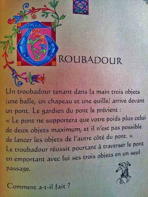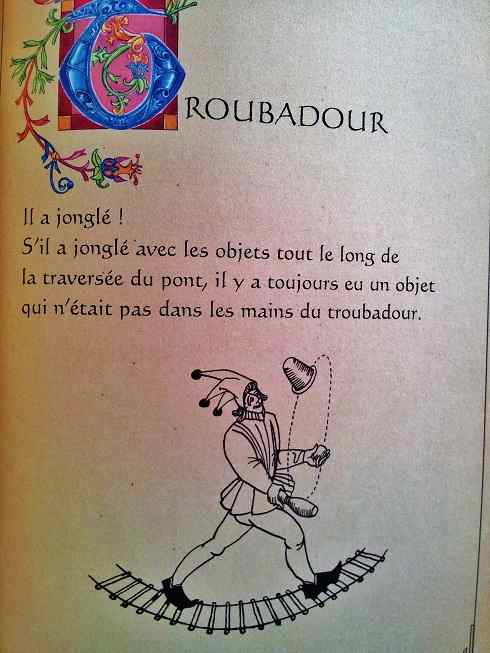 Il traverse en jonglant!??!? Comme ça il y a toujours un objet en l'air au minimum. Les troubadours savent jongler, ça tombe bien.