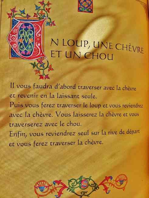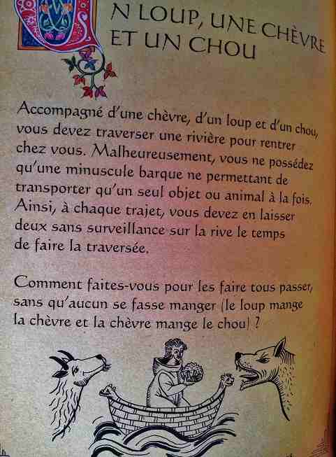 [New10] j'amene la chevre,ensuite je j'amene le loup, je reprend la chevre avec moi,je prend le chou et je laisse la chevre,et je reviens a la fin pour reprendre la chevre!