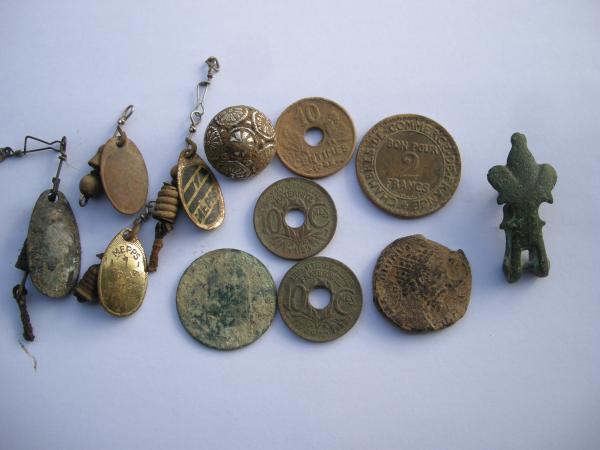 Voici le rĂ©sultats de la pĂȘche : un pendant mĂ©diĂ©val postĂ© d'e l'autre cĂŽtĂ©, quelques rondelles dont un dupondius de Marc AurĂ©le , 4 cuillĂšres de pĂȘche et je vous passe les plomb divers et variĂ©s