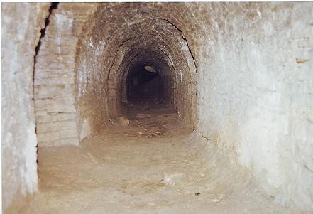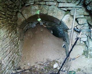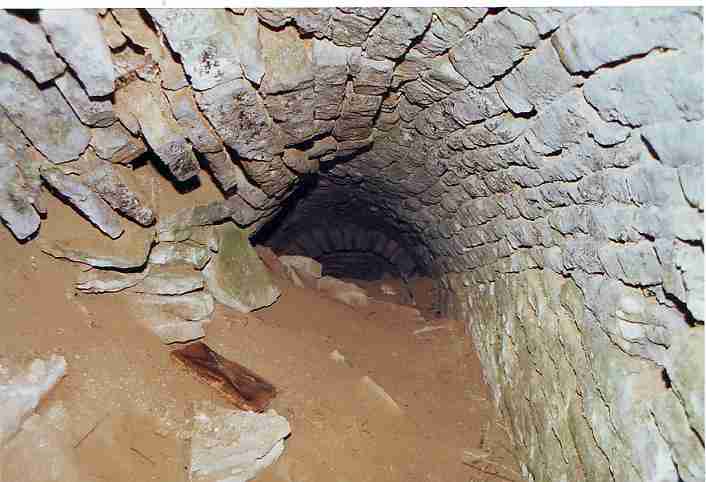 il y a donc sur notre terre , a flan de coteau et a moitié enterré 2 entrees d'un coté un petit labyrinthe vouté de 50 pas de long ,en pierre voutée ,accompagné d'alcoves le tout sans issue , et perpendiculaire , a cette entree une autre entrée descendant a une 'fontaine souterraine '( recit de barthelemi morisot) ces vestiges ont été decouvert en 1601 par un paysan.