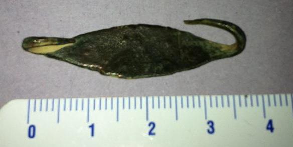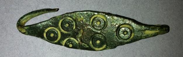 Une agrafe de linceul à double crochet avec décor de cercles oculés, tracés au drille.