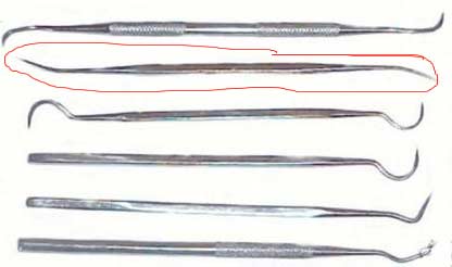 j'ai aussi récupéré un ustensile de dentiste, celui entouré en rouge. Une fois encore affiné à la pointe, c'est top pour nettoyer les petits objets à la loupe ou la binoculaire. Mieux que l'aiguille.