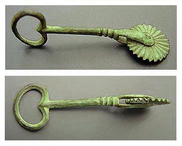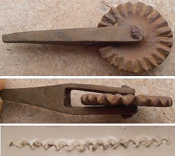 La grosse différence avec la tienne est l'anneau qui est perpendiculaire au tranchant de la molette, ce qui m'avait tout de suite fait penser à un ustensile pour réaliser des motifs sur des poteries.
