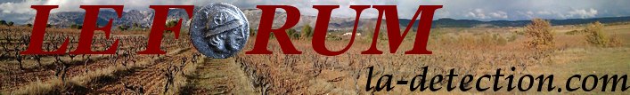 Les monnaies et les objets publiés sur ce forum sont censés faire partie de collections particulières, avoir été découverts fortuitement, ou bien être le fruit des recherches de prospecteurs “autorisés”, et avoir été déclarés selon la loi, le webmaster n’ayant pas la faculté de vérifier la provenance et le devenir de chaque objet. Ensemble, respectons la loi 89.900 et respectons le patrimoine archéologique.