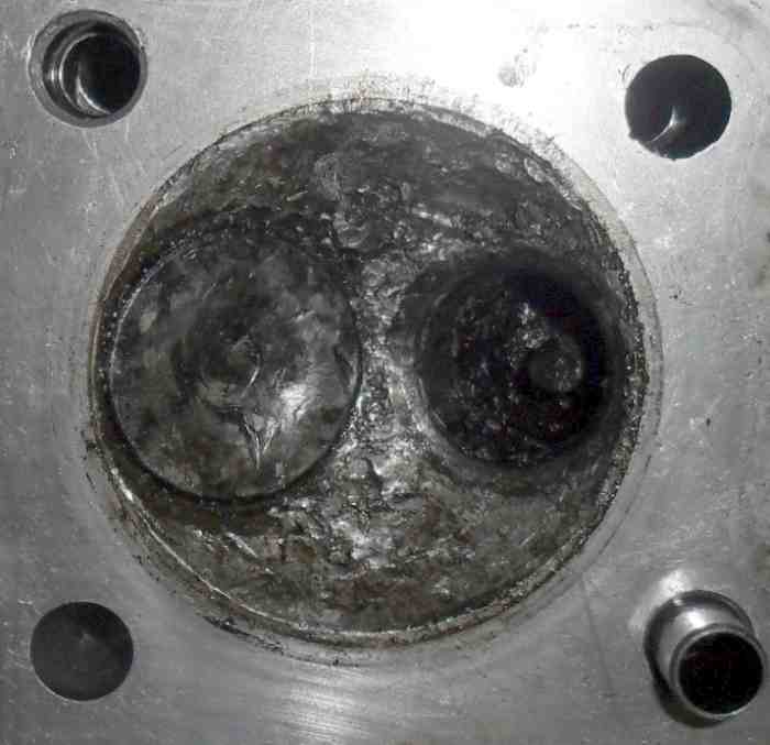 Voici l'état de la culasse. Une soupape c'est fait la malle, et la bougie on ne la voit même plus, complètement martelée. re