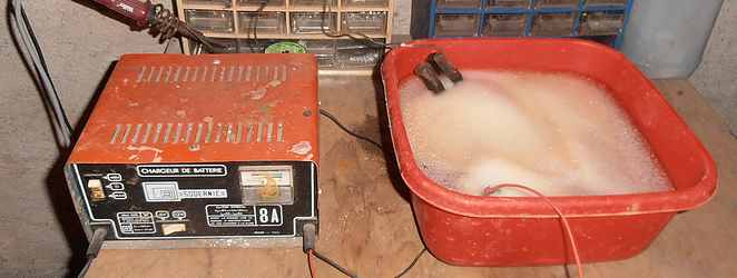 J'ai justement un truc qui trempe en ce moment, voilà une photo de mon installation...Oui je coupe le courant avant de plonger les doigts sinon ça pique un peu...