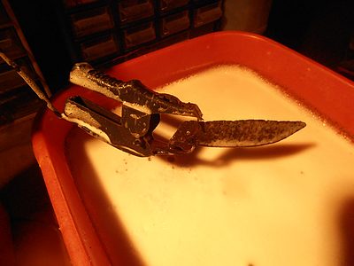 Pour le carreau d'arbalète : je me suis rendu compte que parfois le courant ne passe pas dans l'objet car la rouille n'est pas conductrice, il faut gratter avec une lime jusqu'au métal au niveau du contact avec la pince pour que le courant passe dans l'objet. J'ai un carreau d'arbalète que je n'ai jamais électrolysé car je pense qu'il est quasiment entièrement constitué de rouille.