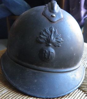 Voici un casque Adrian français( grenade pour l'infanterie), restauré avec un copie de jugulaire (l'originale a disparue, probablement pourrie) et monté sur un support, qui montre la médaille de Verdun.