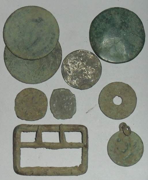 2 savo, une 6 deniers Dardennes usée, une 50 cts argent napo III, 2 deniers tournois, une monnaie trouée, une boucle et une médaille qui a l'air fort sympathique.