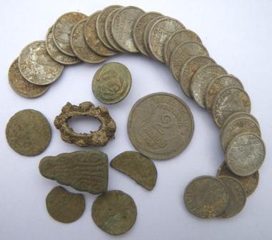 Petite reconaissance : 1 double tournois, un denier tournois, une 2F 1946, une applique méro (un 'décapsuleur à la Acéromique' ) et ... ma première boursée!!!!!