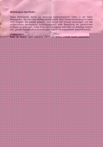 Cette radiosonde a servi pour mesurer les données météorologiques de la haute atmosphère. Elle a déjà rempli sa fonction. Sa réutilisation n'est pas possible. Il vous sera demandé, pour contribuer à la protection de l'environnement, d’éliminer l’ensemble de relevage aérologique selon les normes en vigueur. Si cela ne pouvait être fait en totalité ou en partie, renvoyez-nous ce qui n’a pas pu l’être à l’adresse indiquée.