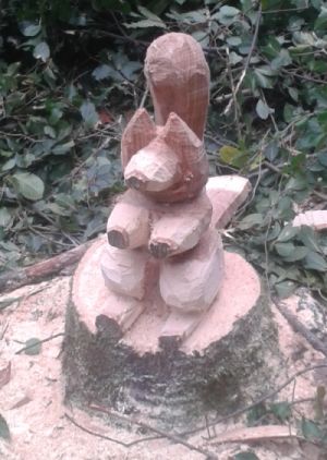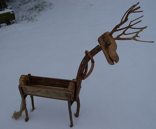 Dans un autre genre, pour rejoindre le bestiaire de Quentouille. Fait avec trois fois rien, un bout de corde, du bois de palette, du bois mort ramassé dans le jardin. Les yeux proviennent d’un manche à balai, le collier une branche d’hortensia naturellement courbe.