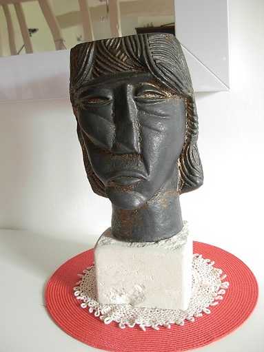 Dans une autre vie je me suis essayé à la poterie. Réalisée à partir d’une photo dans un catalogue d’expo. Hauteur 32 cms. 2 cuissons, la deuxième avec apport d’oxydes métalliques, ce qui explique les reflets or.