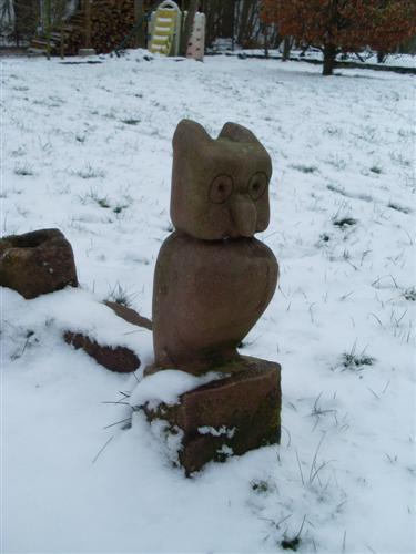 ma toute première sculpture, un hibou taillé dans une borne en grès rose.