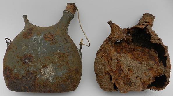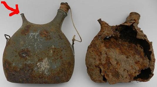 Sur la photo, à gauche, une gourde achetée en brocante et à droite, celle trouvée dans un fossé, dans un bois du 41 ( donc certainement jetée là , comme détritus )