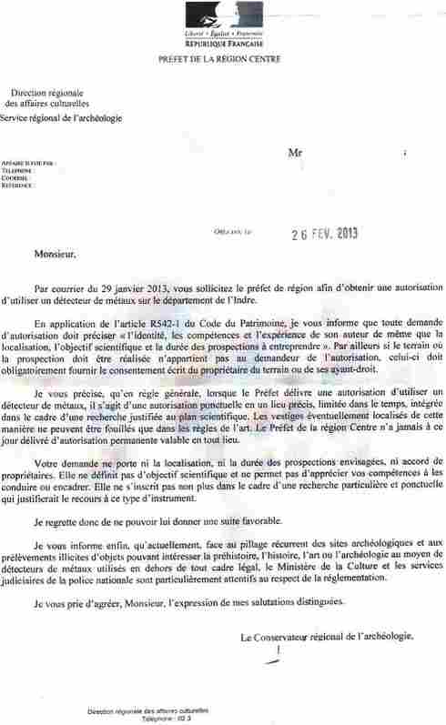 Voici la réponse qui a été faite à Jef36 par le SRA concernant une demande d’autorisation de prospecter un terrain.