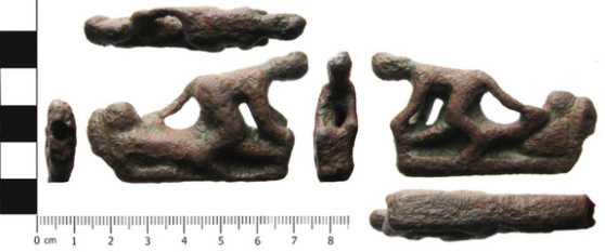 Provenance Angleterre. Manche de couteau romain en cuivre, représentant un homme allongé sur lequel se tient une femme. Il lui met la main sur la fesse gauche.