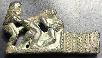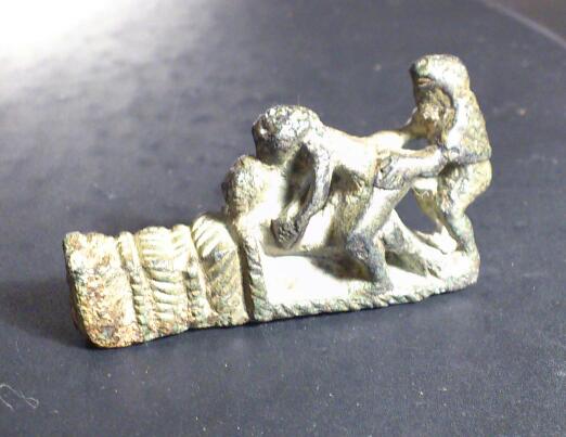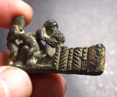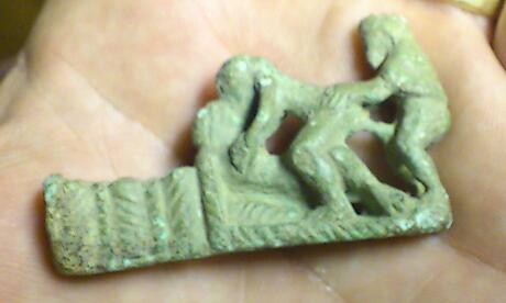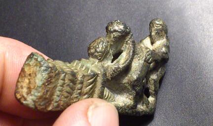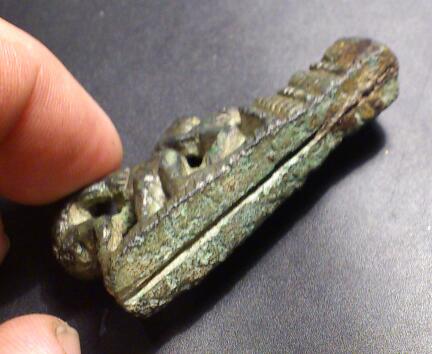 Selon mes quelques recherches rapide sur le net, il semble qu'il s'agisse d'un manche de couteau pliant romain, il est en bronze, lourd et beaucoup de détails sont encore visible, chignon de la romaine dévergondée (elle est au milieu ), les yeux du monsieur 'derrière', les mains, des ocelles sur la cape et le drapé au sol..............Suis trés heureux, que pensez vous de l'objet ?