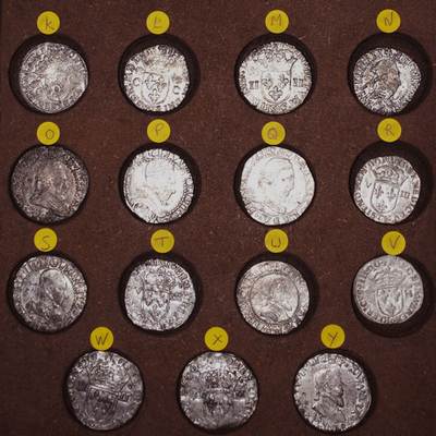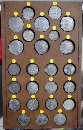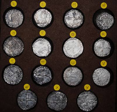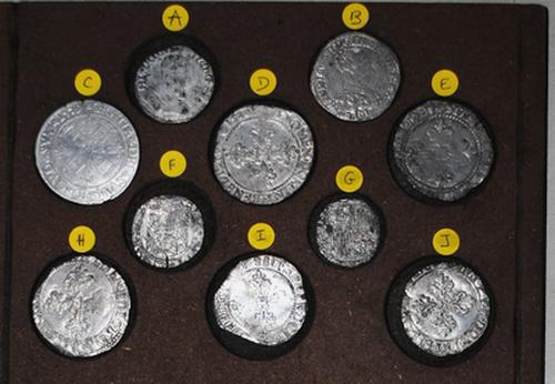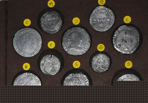 Je les ai classé par ordre chronologique de 1554 à 1596, période trouble dans le royaume de France.Le fait qu'il y ai 2 espagnols me laisse à penser que ce dépôt appartenait peut-être à un Ligueur (allié de l'Espagne)
