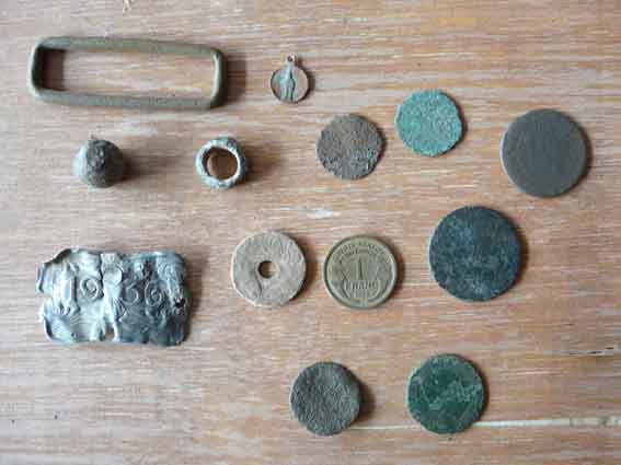 Il y a une médaille 19eme, soit un petit anneau ou soit un reste de clef de montrede gousset, une plaque fiscale pour vélo (1936 )