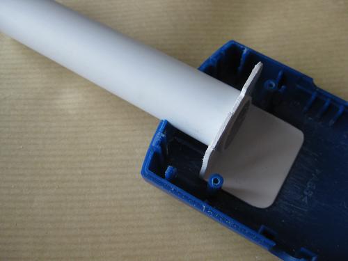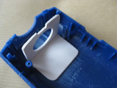 Afin de consolider la fixation du tube, j'ai réalisé, dans un morceau d'équerre plastique, un palier intermédiaire pour que le collage sur le boîtier soit moins sollicité. Ce palier est collé sur le fond du boîtier à la colle cyano en ayant poncé les deux parties à assembler et éliminer les nervures qui me gênaient.