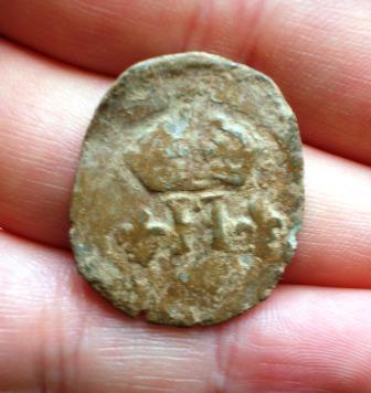 - Une face semble savonnette. Impossible avec le doigt d'enlever la terre et les concrétions. Sur la 2ème face, patine marron ou alors fine couche de terre lisse et collée, je distingue la forme d'une grosse couronne avec deux barres en-dessous.
