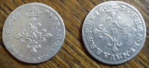 Les 2 monnaies argent sont des 4 sols, une de 1675 A et l'autre 1675 D