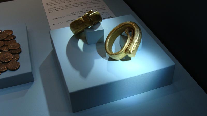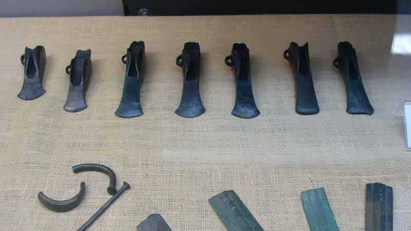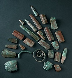 Dépôt du Bronze final (950-800 avant notre ère) découvert à Surtainville (Manche) contenant des fragments d’épée, de hache, de bracelet et un lingot de bronze probablement destiné à la refonte