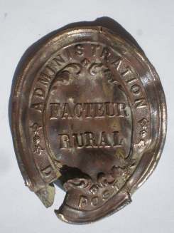 Plaque de facteur rural , III ème république (fin XIX ème) , cette plaque était portée sur le baudrier qui tenait la sacoche du facteur.Dommage qu'elle soit tellement abîmée , on doit pouvoir un peu améliorer ça.Philatéliste , j'ai été content de trouver cet objet.