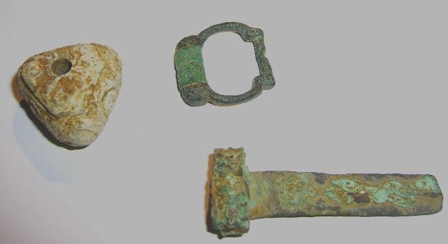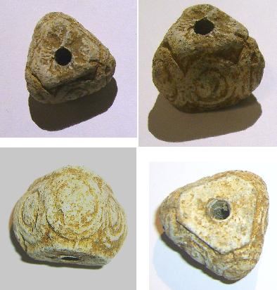 * Un truc plombeux triangulaire, evasé, de 16 mm de haut x 3 fois 21 mm de large avec une répétition des décors... Plat d'un côté, plutôt décoré de l'autre.. Plutôt intéressant, je crois, peut être un décor de meuble / bougeoir sans grande conviction... J'aurais préféré l'extremité de dague que j'ai initialement imaginé