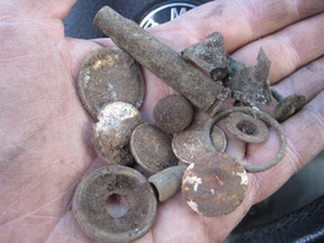 Il y a de tout : 2 monnaies de 10c des années 60, 1f des années 40 ou 50, 5f des années 40, une balle de mousquet, un bout d'une lampe à pétrole, un anneau,etc..