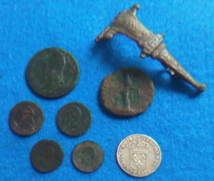 Bonjour à tous, voici une superbe sortie en labour à partager avec vous, résultat de la journée, 1 fibule avec 1 monnaie romaine, 3 révolutionaires, 1 napoléon III, 1 denier dournois et surtout cette magnifique royal en argent de 20 mm ...... neuve, à bientôt