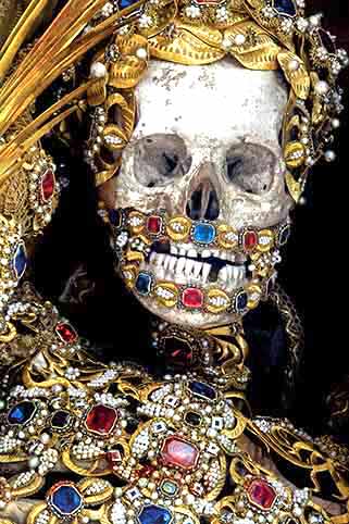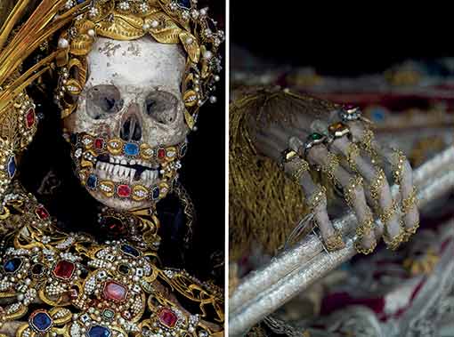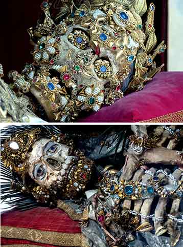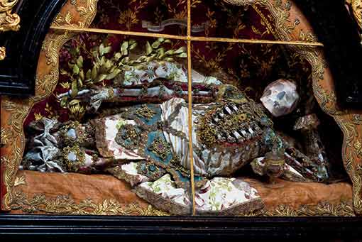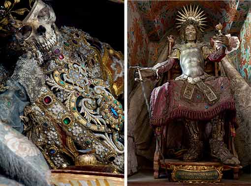 En 1578, on a fait la découverte à Rome d'un réseau de tombeaux souterrains contenant les restes de milliers de premiers martyrs Chrétiens. Beaucoup de squelettes de ces saints supposés ont été bientôt enlevés de leur lieu de repos et envoyés aux Églises catholiques en Europe pour remplacer les reliques saintes qui ont été détruites pendant la Réforme Protestante. Une fois en place, les squelettes ont été alors soigneusement rassemblés et conservés dans des costumes, des perruques, des bijoux, des couronnes, le lacet d'or et l'armure, comme un rappel physique des trésors divins qui ont attendu dans la vie d'outre-tombe.