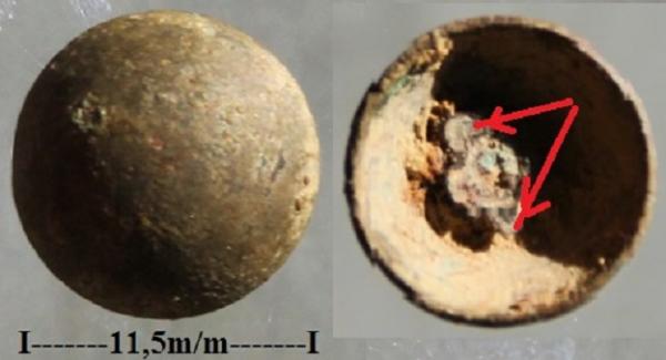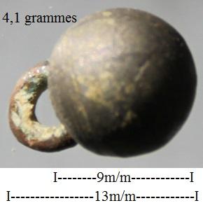 1 bouton grelot ou battant de clochette en ?? peut être tombac, l'anneau est en cuivre, 9 m/m de diamètre, poids 4,1 grammes