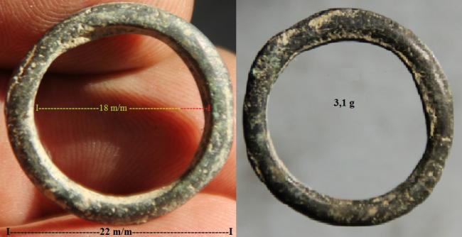 un anneau en bronze, qui a été coulé, diamètre intérieur 18 m/m, diam. extérieur 22 m/m, poids 3,1 grammes