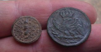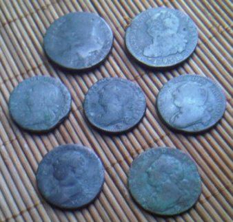 [1757] Bonjour à vous tous, voici une boursée de monnaies, 10 monnaies mais je poste que les 6 plus belles ...... a savoir qu'elle se composait de deux '2 sols' et 8 '12 deniers', toutes en métal de cloche sauf une en bas à droite qui est verte, bronze ????
