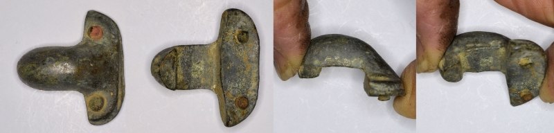 Bonjour à tous. Ce n'est pas les doigts que je cherche à identifier mais l'objet tenu. Je n'ai aucune idée de ce que c'est. Pour la matière, très lourde, je pense à une sorte de bronze bourré d'étain, l'aspect des 2 sols en métal de cloche. Les deux rivets sont en cuivre, on aperçoit la couleur sur l'un deux. L'objet pèse 31 grammes pour 35 x 32mm. C'est dense. Si quelqu'un a une idée, toute piste est la bienvenue. Merci d'avance.