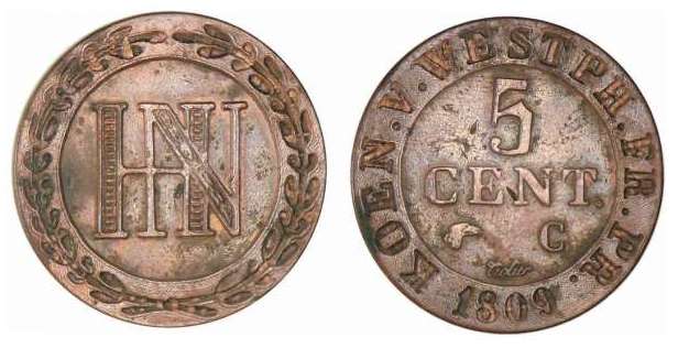 est du petit frère Jérôme Napoléon Bonaparte roi de Westphalie (Allemagne), une 5 centimes en cuivre.