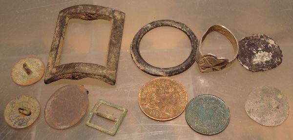 Trouvé entre autre, un sol et un demi sol de Charles Emmanuel, 1cts suisse 1921, 50 cts chambre du commerce, l'anneau classique, une micro boucle et cette bague en argent que je reposte coté identification.
