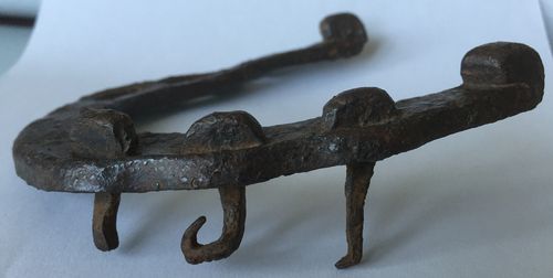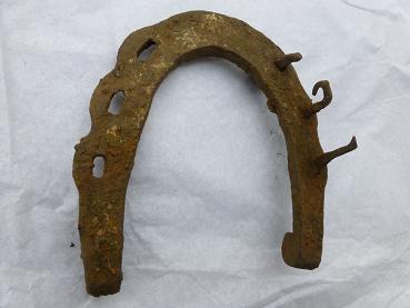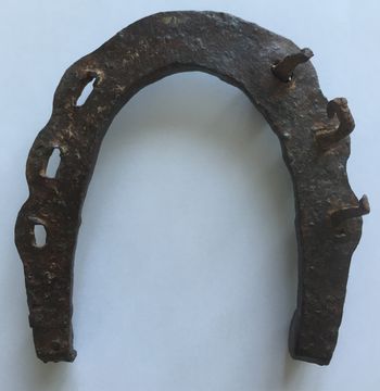 Trouvé dans la même forêt que la médaille religieuse (post 116 570) et les trois cylindres en plomb (post 116 599), ce fer à cheval possède encore trois de ses clous et présente des bords 'ondulés' ainsi que des extrémités recourbées. Je ne sais pas de quel métal il est fait car, contrairement aux autres fers fortuités jusqu'à maintenant, il n'est quasiment pas rouillé