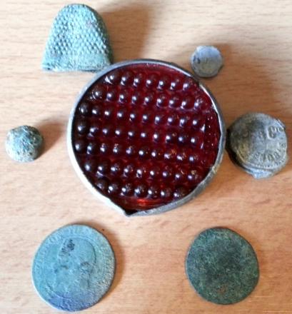 En dehors de ça, une 5 centimes Napo 3 fatiguée, une monnaie savo au possible, 2 plombs de scellés, un clou de tapissier et un dé à coudre.