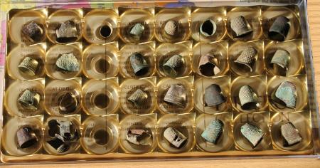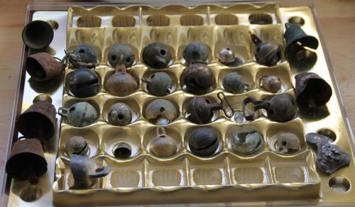 Une boite de chocolats vide avec ses compartiments, des clochettes et grelots et tout est rangé