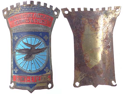 Là ou il y a les inscriptions, USINE FRANCAISE de CYCLES , il y a des reste d'émail bleu, dans les étoiles les lettres (une par étoile) Z A S et en bas St ETIENNE