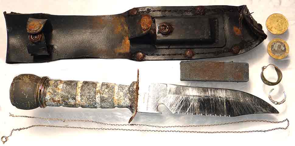 Sous un rocher, bien cacher dans une petite fente entre le rocher et le sol,... un bon son,.... et hop que vois-je..?? Un couteau à la Rambo, dans son étui et sa pierre à aiguiser.....J'ai pensé à du WW2 mais non, il est récent made in Taïwan....