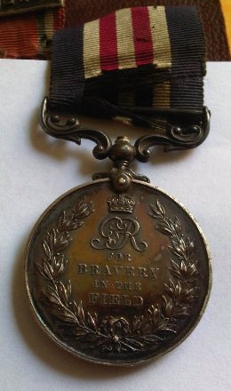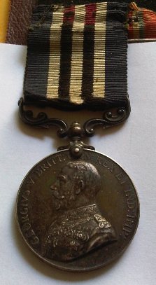 Médaille Anglaise, bandes bleu nuit-blanches-noirs er rouges à la place des noirs pour l'arrière.