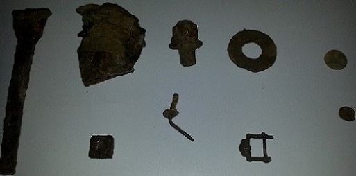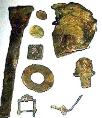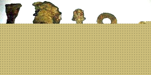 On voit un pic de Herse, un gros boulon, une rondelle en ferraille(ma 2eme), un fer a boeuf, un rivet et un boulon carré.