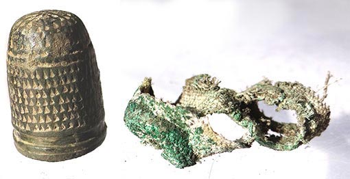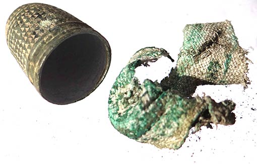 J'avais trouvé un demi-ceint du XVIème siècle qui comporte encore des morceaux de tissu à l'intérieur.Ce sont les oxydes de cuivre qui ont imprégné les fibres, les rendant imputrescibles.Je me souviens même d'un dé à coudre qui renfermait une petite pièce en cuivre époque Henri III.A+